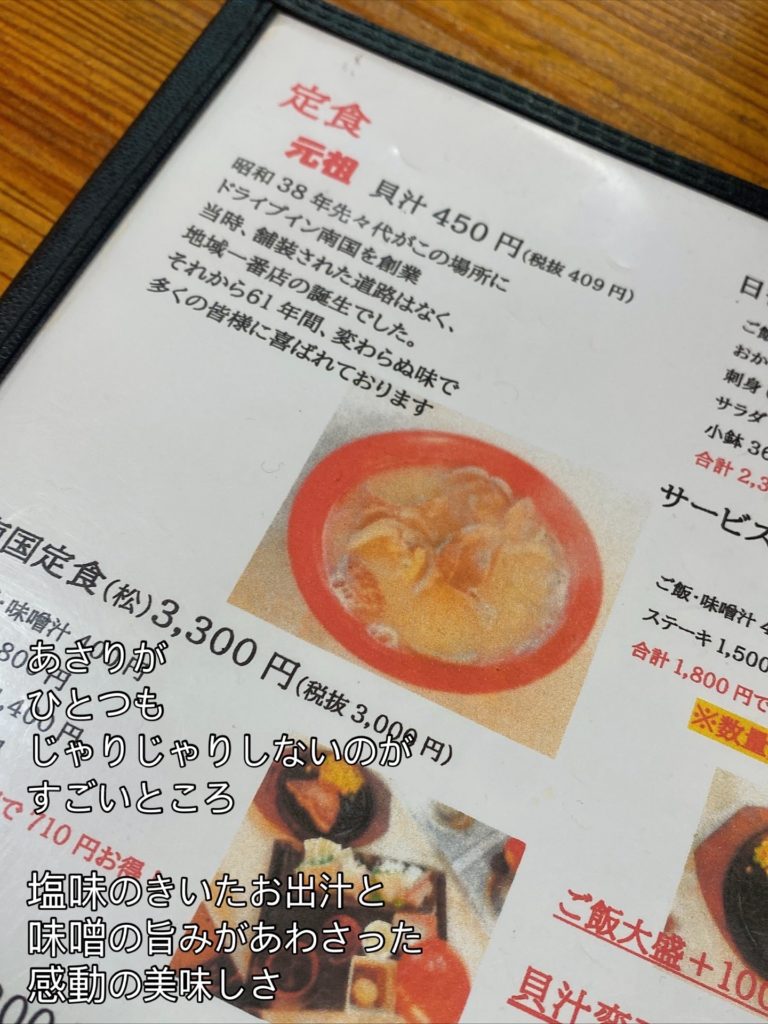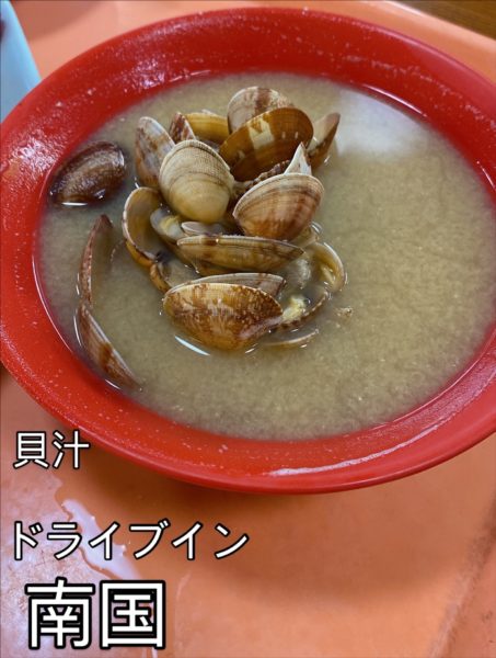 山口県山陽小野田市にある『みちしお』さんのちょっと先?にある『ドライブイン南国』さんです。どちらも貝汁推しですね。北九州市方面からの通り道から行くと、山陽小野田市に行くのに通る道の途中にあるのが『みちしお』さんです。しかし、みちしおさんを通り過ぎて小野田サンパーク方面へは曲がらずにまっすぐ行くとすぐに見えてくるのが『南国』さんです。この説明だけでわかる人はわかると思います。わからない方はGoogleさんで調べてください。私も数年前にここの存在に気づいたので。もっと宣伝してもいいと思います。知名度がちょっと低い感じがします。