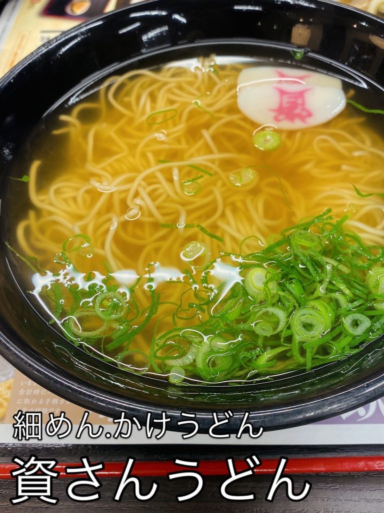 かなりのメニュー数がある資さんうどんさんですが、シンプルにお出汁を楽しむならやはり『かけうどん』です。普通の麺のほかに、細めんというのがあり、麺はひやむぎくらいの細さの麺です。もちもちとした普通の麺とは違い、どちらかというと『にゅうめん』に近い細めんも個人的にはかなり好きです。