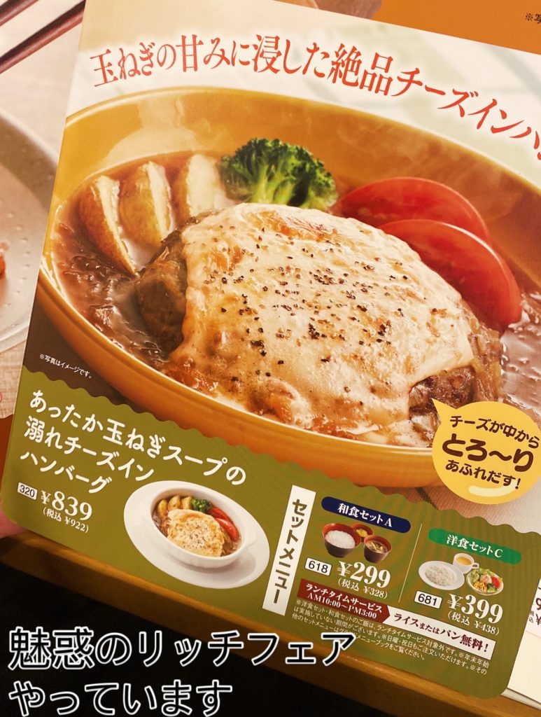 いま期間限定?で『魅惑のリッチフェア』をやっています。どのメニューも気になるものばかりです。そのなかで今回は『あったか玉ねぎスープの〜』を食べました。まるで某有名チェーン店の伝説のあのメニューに浸されているかのような美味しさ。まさにいいとこどり。これはやばいほど美味しいです。ハンバーグの中にもチーズがたっぷり。さらにハンバーグの上にもチーズがたっぷりとかかっています。チーズ好きにはたまらない。かなりオススメです。